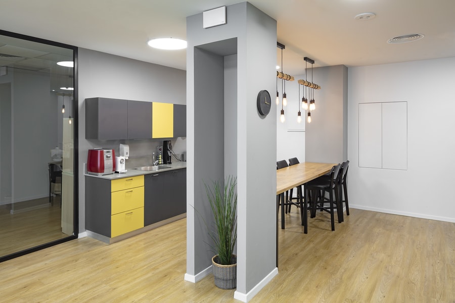 הרצפה חופתה באריחים בגווני בטון והמטבחונים עוצבו בגווני עץ וכחול ואריחי קיר מרהיבים.